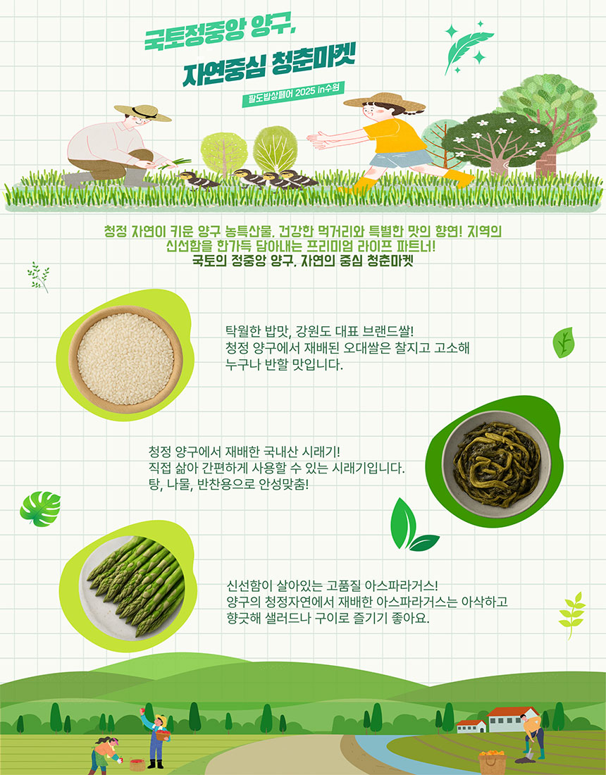 양구군의 신선한 쌀과 건강한 삶은 시래기, 아스파라거스, 달콤한 꿀과 사과즙, 고소한 들기름·참기름, 그리고 정성 가득한 건나물과 장아찌까지, 자연의 맛과 영양을 한 상 가득 담았습니다. 믿고 즐길 수 있는 프리미엄 건강 먹거리로 팔도밥상페어에서 만나보세요!