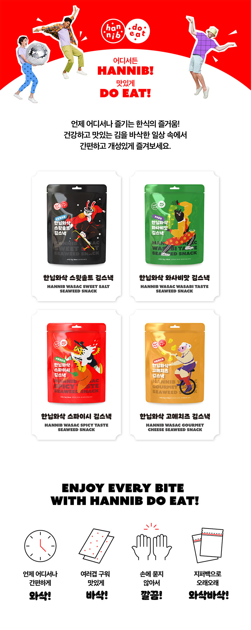 코끝 찡 와사비, 핫 스파이시, 달짭쪼름 스윗솔트, 고소한 고메치즈맛 총 4가지로 구성되어있습니다.